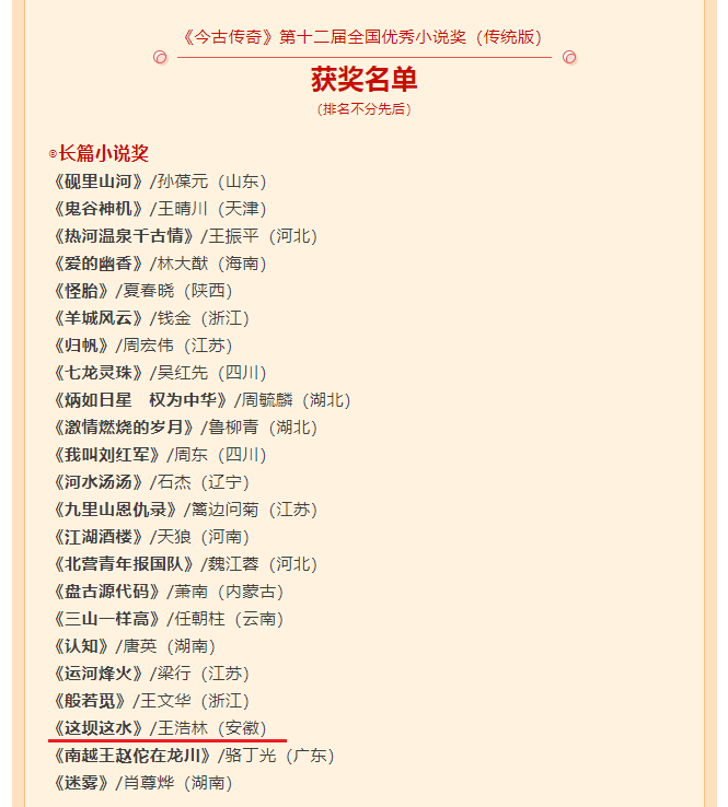 宿松融媒讯 12月18日,由湖北省文学艺术界联合会主管的《今古传奇》杂志社公布第十二届全国优秀小说奖(传统版)获奖名单,宿松县作家王浩林创作的小说《这坝这水》获“长篇小说奖”。