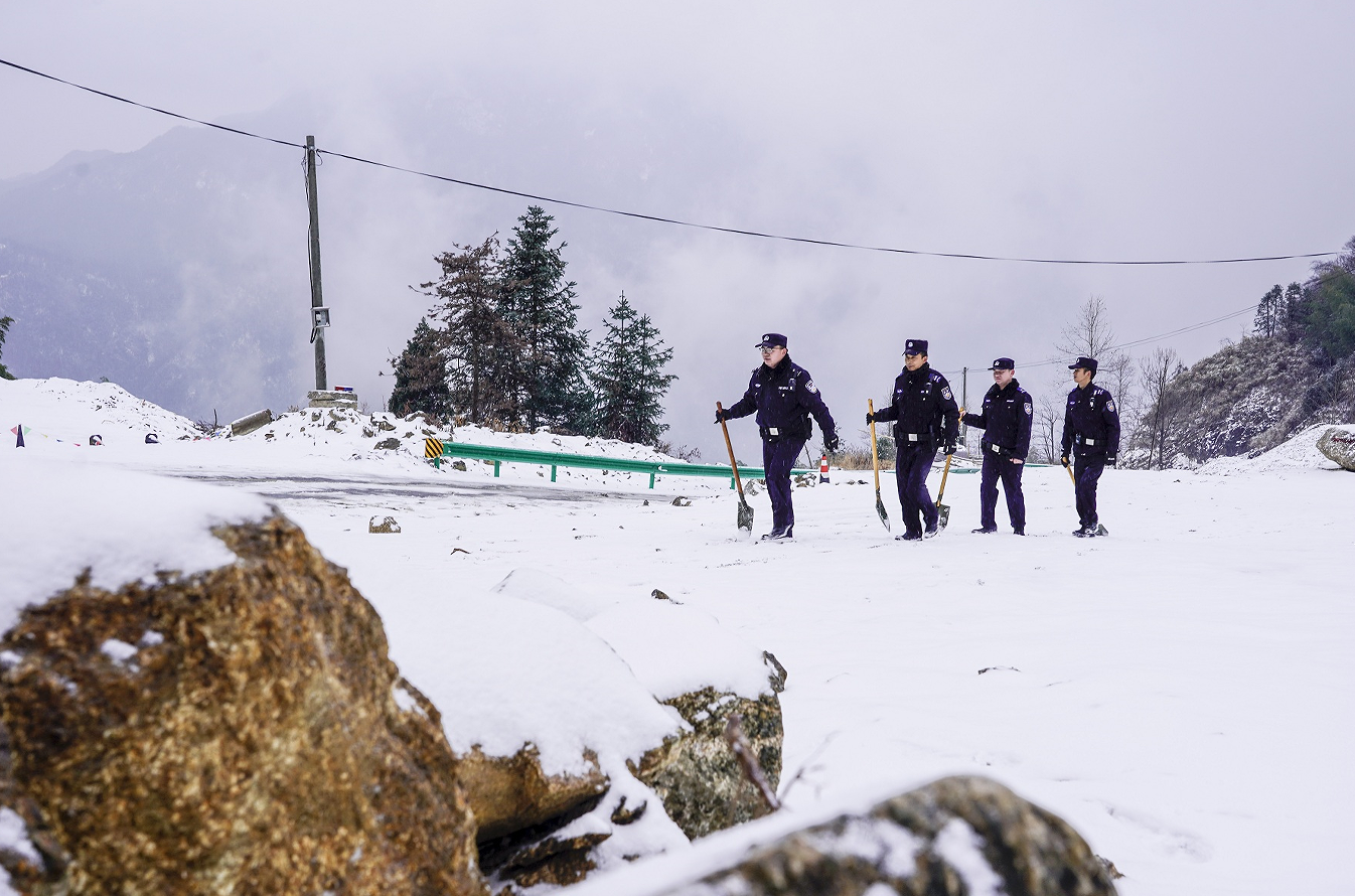 险情就是命令。柳坪派出所闻雪而动,迅速组织4名警力组成巡查专班,携带铁锹、工业盐、扫帚等除雪物资,驾驶警车直奔高海拔重点区域邱山村,一场“车巡护航+步巡守点”的低温天气安保行动全面展开。