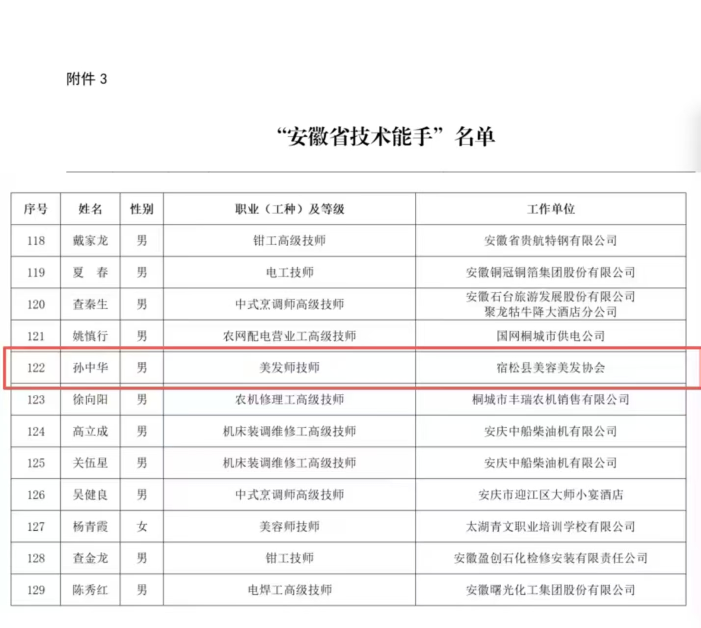 宿松融媒讯 日前,安徽省人力资源和社会保障厅发布关于表彰第十五届全省高技能人才的决定,宿松县人社局推荐的美发师孙中华在表彰的“安徽省技术能手”名单之列。此表彰安徽省五年开展一次,孙中华获此殊荣,实属不易。孙中华,宿松县渼艺造型沙龙技术总监、宿松县美容美发协会秘书长,从事美发行业26年,深耕剪发、烫染等造型设计领域,先后获评“安徽省金牌职工”“安徽省技能大赛一等奖”“全国职业技能大赛二等奖”,2026年1月荣获“安徽省技术能手称号”。