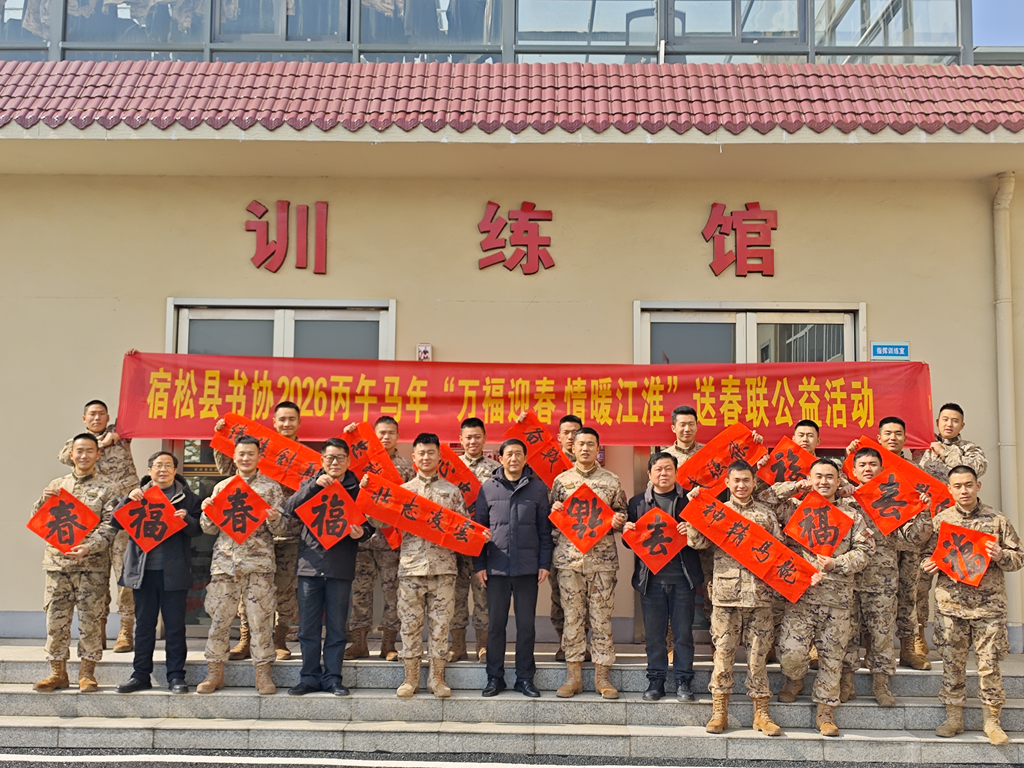 宿松融媒讯 新春佳节将至,为弘扬中华优秀传统文化,丰富军营文化生活,增进军民鱼水深情,2月11日,宿松县书法家协会、宿松县书画院组织书法家走进驻地军营,开展“送福进军营、墨香迎新春”暨2026丙午马年“万福迎春 情暖江淮”送春联公益活动。