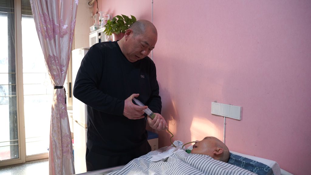 四年的坚守,早已把烦琐的护理变成了刻在骨子里的习惯。每天清晨,尹立新的生物钟准时响起:先到厨房把米、肉、蔬菜打磨成细腻的流质食物,再端到妻子床边。他熟练地拿毛巾围住妻子脖颈,用注射器吸满食物,对着妻子的嘴一点点缓慢推送,生怕动作快了呛到她。喂食后,他会轻轻擦拭妻子的嘴角,再帮她调整到舒适的卧位。看着妻子顺利吞咽食物的模样,便是他一天中最安心的时刻。