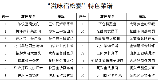 此次获评的16道菜品虽具有一定地域特征,但菜名表述风格偏向口语化。为进一步提升“滋味宿松宴”的品牌形象与文化内涵,增强其文旅宣传推广和对外展示的适配性,现对原获评菜名再增冠一个“雅称”,旨在使菜品名称既充分体现地域特色与文化底蕴,又展现地方美食的独特魅力,使每一道菜肴成为展示宿松风味的重要载体。