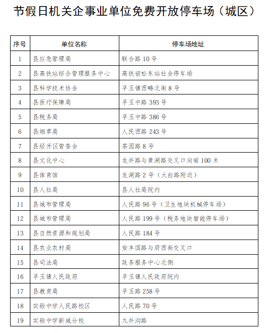 (一)全县范围内具备开放条件的党政机关、事业单位、县属国有企业(涉及安全、保密、特殊应急等要求的单位除外)的内部停车场(具体开放单位名单详见附表)。