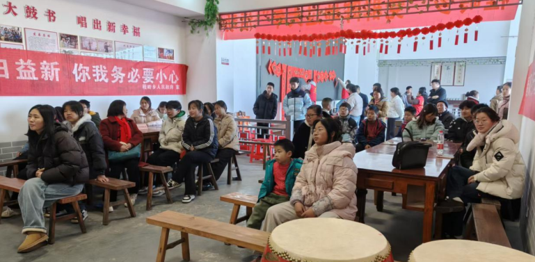 活动现场,夹板铿锵,唱腔悠扬。程岭大鼓书非遗传承人江金华手持鼓槌、敲响书鼓,带来《西厢记》《绿竹赞》等经典与新编结合的曲目,将新春祝福、乡村振兴的喜人变化融入抑扬顿挫的说唱中,一个个鲜活的场景、一段段生动的唱词,引得现场观众听得津津有味,掌声、喝彩声此起彼伏。不少村民带着老人孩子前来观看,孩子们好奇地跟着鼓点拍手,老人们则沉浸在熟悉的乡音里,满脸笑意。