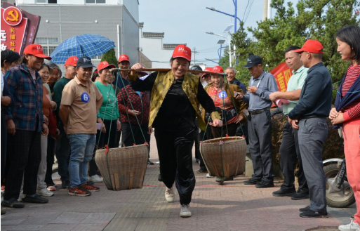 当拔河赛场展现力量之美时,其余五大趣味项目也相继全面开启,将运动会变成了欢乐的海洋。在“同心背篮赛”赛场,夫妻、亲友组合背靠着背,夹着象征丰收的“粮篮”,协调步调,横向前行,有趣的“螃蟹式”步伐引得围观群众笑声不断。