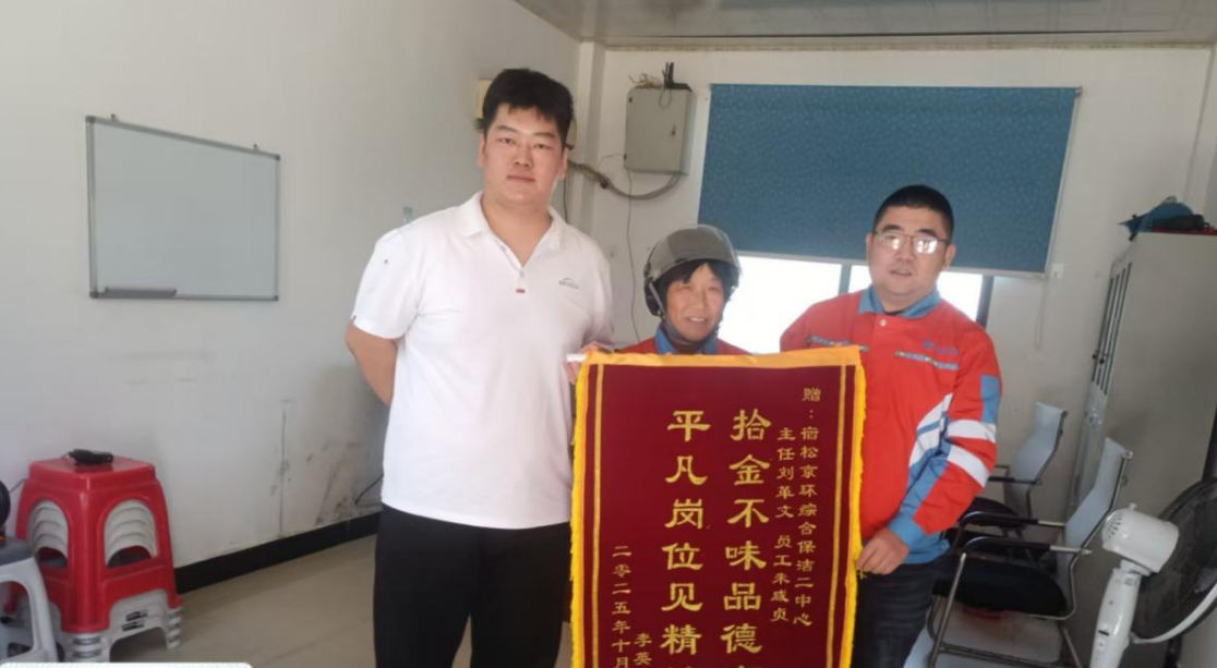 10月23日上午,宿松京环环境服务有限公司经开区二中心办公点楼内格外热闹。李英卓手捧一面印着鎏金大字的红色锦旗,专程来到这里,再次向几天前帮他找回钱包的环卫工人朱咸贞、二中心主任刘革文表达感谢,用最朴实的方式,为这份温暖善举写下续章。